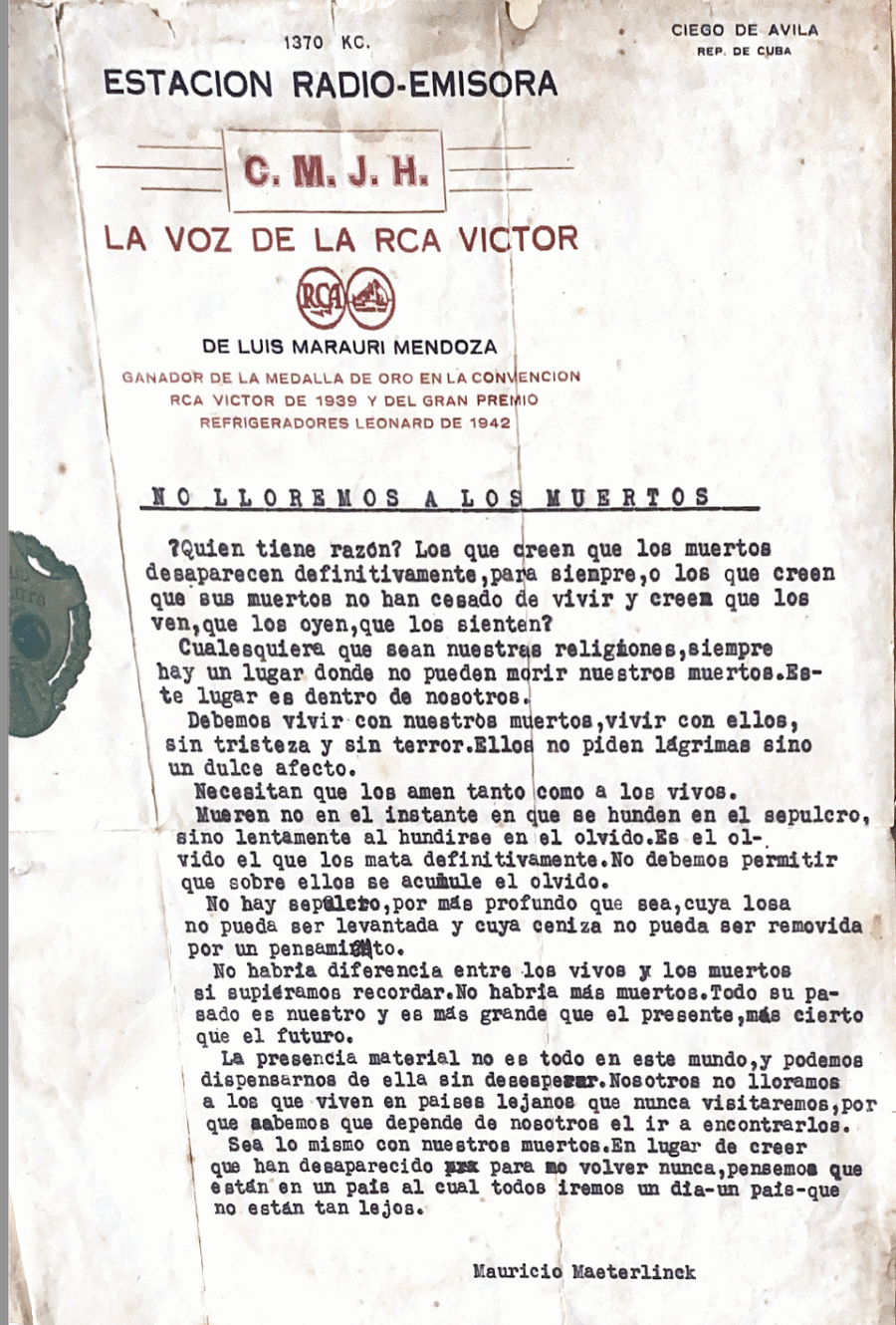 La carta, escrita por José Rodríguez Rivadá —quien supongo era un amigo cercano de mi familia—, está acompañada por un texto mecanografiado de Maurice Maeterlinck, Premio Nobel de Literatura 1911, titulado No lloremos a los muertos.