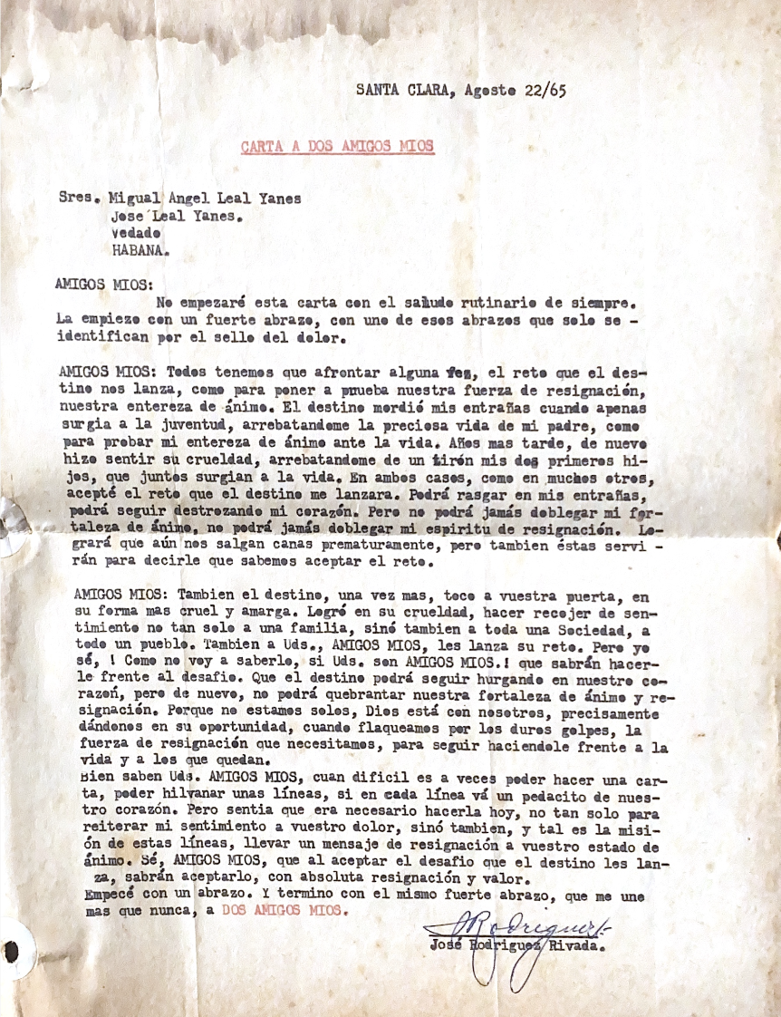 Se trata de una carta enviada a papi, Miguel Ángel Leal Yanes, y a su hermano, José Valentín, fechada el 22 de agosto de 1965, como pésame por la muerte de mi abuela, María Socorro Yanes Pérez.